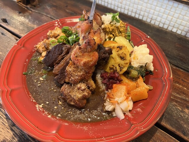 旨辛チキンキーマ&熟成豚のスパイストマト煮込み&鶏もも肉のスパイス串焼きが入った3種盛り!一番人気です!