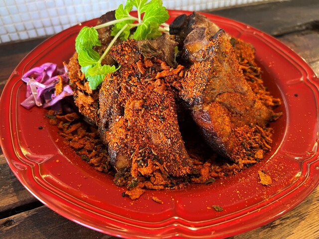 やっぱり今日は肉だという人はコレ!特製スパイスに 12時間漬け込んだ骨付きスパイススペアリブとジャークチキンなどお肉料理3種をドーンっとのせました!周りを気にせずガブリといきましょう!※写真はトッピングエッグ付きです